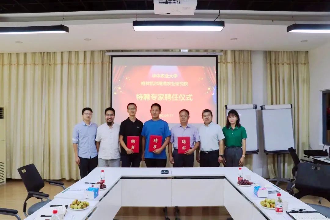 2020年9月11日上午,精准农业研究院在华中农业大学文澜阁举行特聘专家聘任仪式。格林凯尔集团董事长郑勋领、研究院理事长王士英、院长李国怀、特聘专家金国良、袁国杰、魏家鹏及研究院部分员工参加了聘任仪式。
